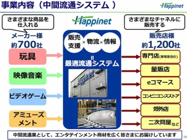 メインはもちろんバンナム商材なんだけど(バンダイのプラモやおもちゃ)ヨドバシヤマダエディオンとかスーパー系大体の大手量販店に玩具とかを卸すのがメインや