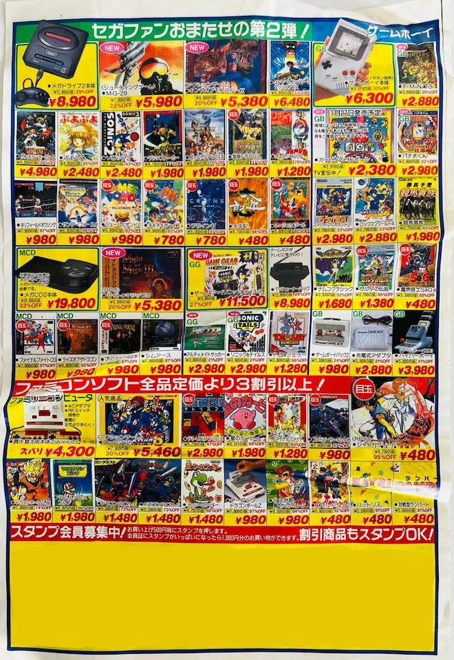 PCエンジンが見当たらないのがちょっと意外。当時ファミ通は妙にメガドラ押しだったが、一般にはエンジンの方がメジャーな印象があったけどなあ。(ニッチな争いだが) 93年のスーファミは大ヒットが減った時期だったけど、チラシのタイトル群を見るとやっぱテンション上がる。