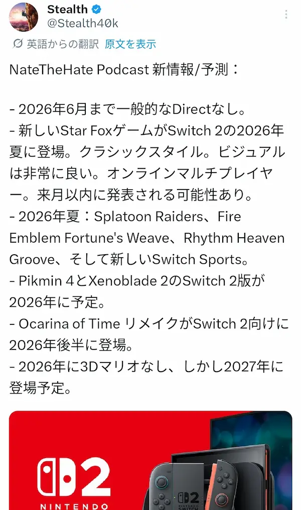 – 新しいStar FoxゲームがSwitch 2の2026年夏に登場。クラシックスタイル。ビジュアルは非常に良い。オンラインマルチプレイヤー。来月以内に発表される可能性あり。