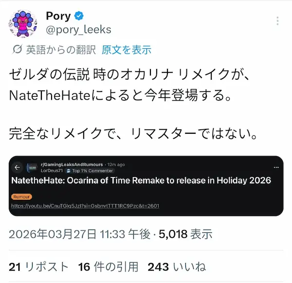– Ocarina of Time リメイクがSwitch 2向けに2026年後半に登場。