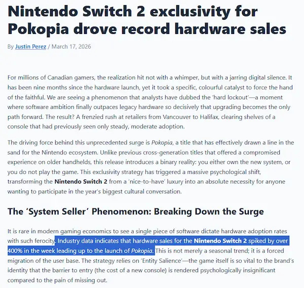 現代のゲーム経済学において、単一のソフトウェアがハードウェア導入率をこれほど激しいほど支配することは稀です。業界データによると、Nintendo Switch 2 のハードウェア販売は、ポコピアの発売に向けた1週間で400%以上急増したことが示されています。これは単なる季節的なトレンドではなく、ユーザー基盤の強制的な移行です。この戦略は『Entity Salience』に依存しており、ゲーム自体がブランドのアイデンティティにとって極めて重要であるため、参入障壁(新しいコンソールのコスト)は、見逃すことの苦痛に比べて心理的に取るに足らないものとなっています。