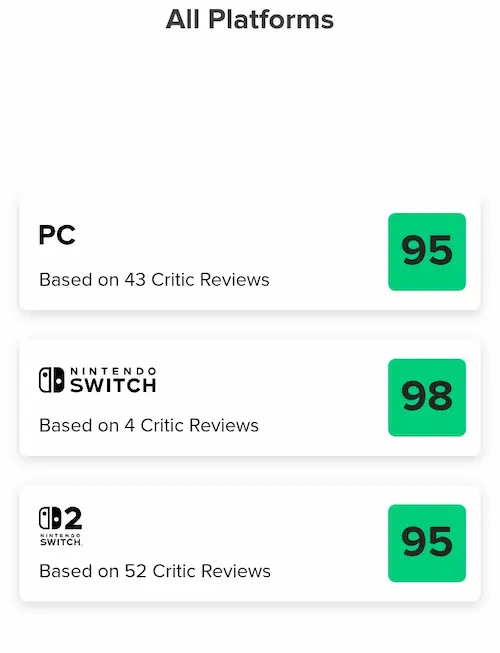 疑問なんだが、Switch2版のスコアよりSwitch版のスコアの方が高いの普通に駄目じゃね?本体の入手性以外は、Switch版はSwitch2版の完全劣化版なのに、点数がそれより高く付いちゃ駄目だろう。