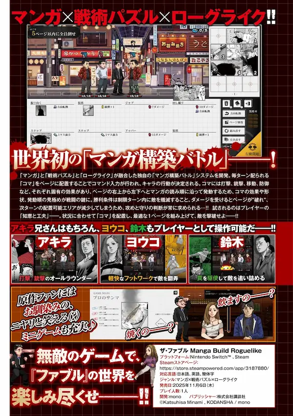 漫画『ザ・ファブル』が初めてゲーム化されることが決定した。漫画×戦術パズル×ローグライクが融合したゲーム『ザ・ファブル Manga Build Roguelike』として、Nintendo Switch、Steamで11月6日に発売される。