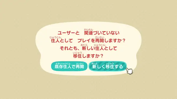 「ユーザーと関連付いていない住民としてプレイを再開」