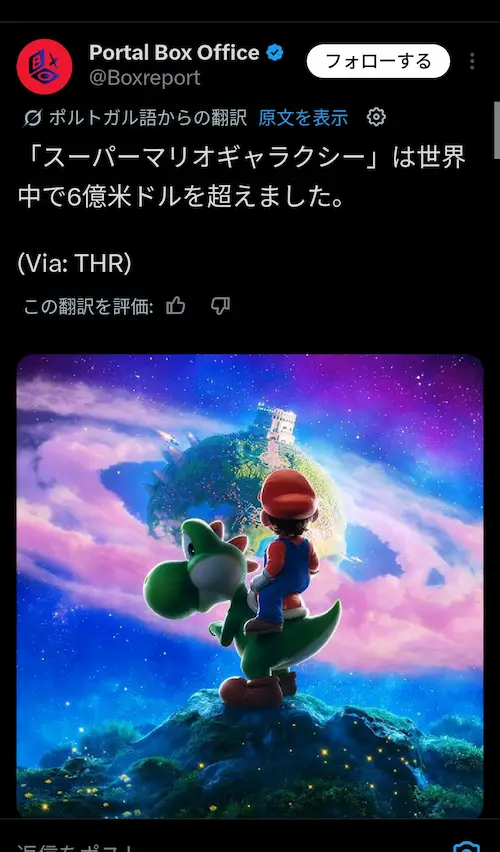 2023年公開の映画『ザ・スーパーマリオブラザーズ・ムービー』は、2週目の週末時点で全世界累計興行収入が約6億7796万ドル(約909億円)を記録しました。