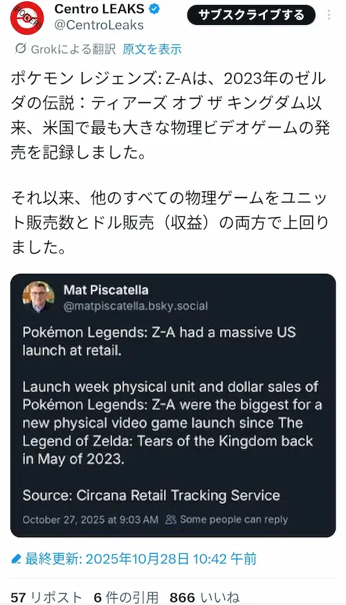 ゼルダTOTKの発売以降、米国ではTOTKに匹敵するゲームがポケモンLZAまで無かったって事