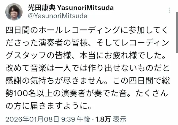 - 四日間のホールレコーディングに参加してくださった演奏者の皆様、そしてレコーディングスタッフの皆様、本当にお疲れ様でした。改めて音楽は一人では作り出せないものだと感謝の気持ちが尽きません。この四日間で総勢100名以上の演奏者が奏でた音。たくさんの方に届きますように。