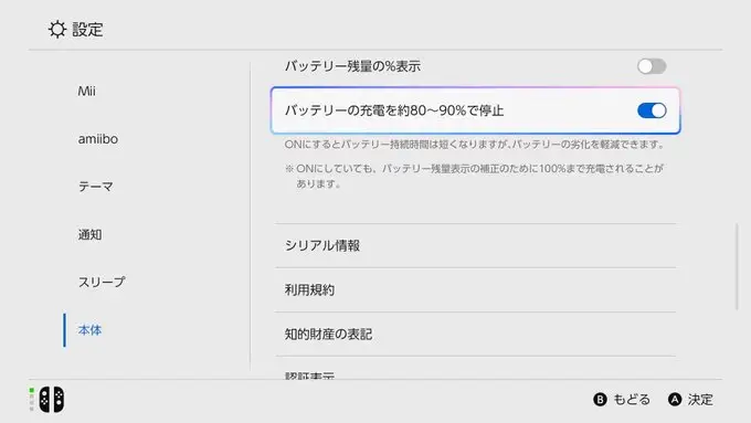 ※バッテリー残量表示の精度補正のため、本機能を「ON」にしていても100%まで充電する場合があります。 pic.twitter.com/wOaHfuUr8i— 任天堂サポート (@nintendo_cs) April 9, 2026