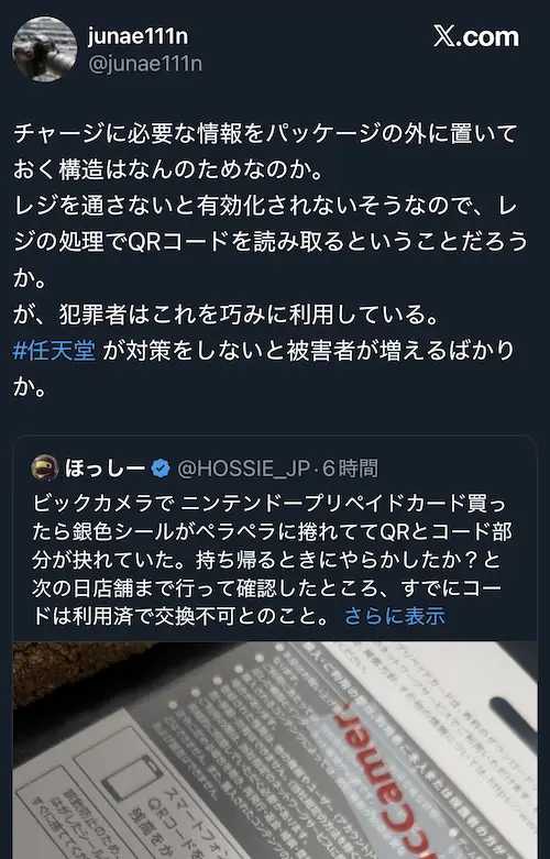 ビックカメラで ニンテンドープリペイドカード買ったら銀色シールがペラペラに捲れててQRとコード部分が抉れていた。持ち帰るときにやらかしたか?と次の日店舗まで行って確認したところ、すでにコードは利用済で交換不可とのこと。… pic.twitter.com/O66YIDkSCH
